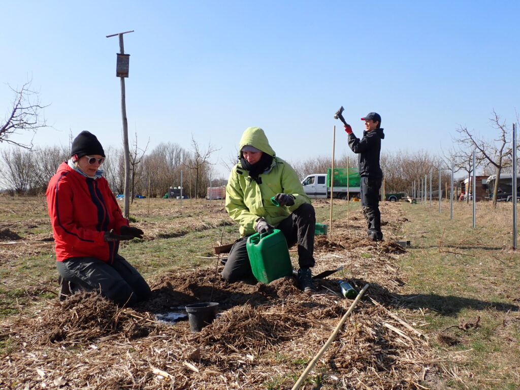 Eine Mitarbeiterin von dieUmweltDruckerei beim Aufbäumen mit dem Bergwaldprojekt. Fotokredit: dieUmweltDruckerei